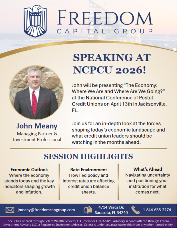 Freedom Capital Group's John Meany will be speaking at the National Conference of Postal Credit Unions (NCPCU) on April 13th in Jacksonville, FL. His session, "The Economy: Where We Are and Where Are We Going?", couldn't come at a more critical time.